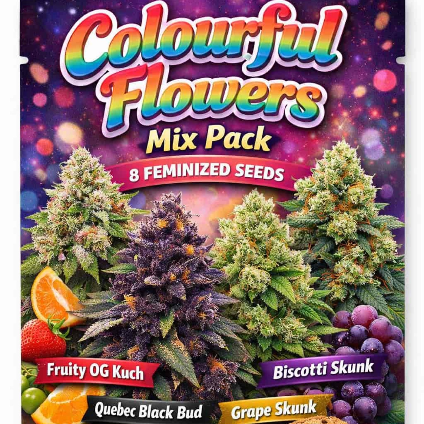 The Colourful Flowers Mix Pack is a curated feminized selection made for growers who want variety in one order—without committing to a full pack of a single strain. Inside you’ll get 8 premium feminized cannabis seeds, split into 4 strains (2 seeds each), chosen to deliver a wide spread of terp profiles, bud styles, and overall garden vibes.